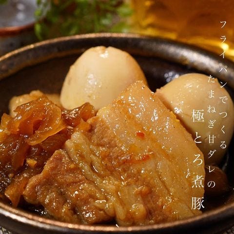 とろとろの玉ねぎが甘くて絶品な煮豚の献立です。フライパンで調理ができますので、手早く作りたい時には手軽な主菜ですね。
