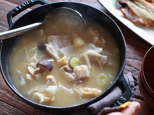 鮭と相性の合う味噌汁には塩こうじ入り豚汁