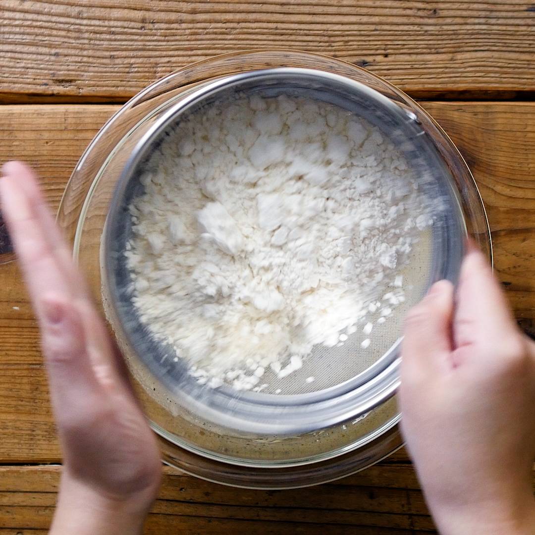 薄力粉をふるい入れて粉気がなくなるまで混ぜ合わせます。