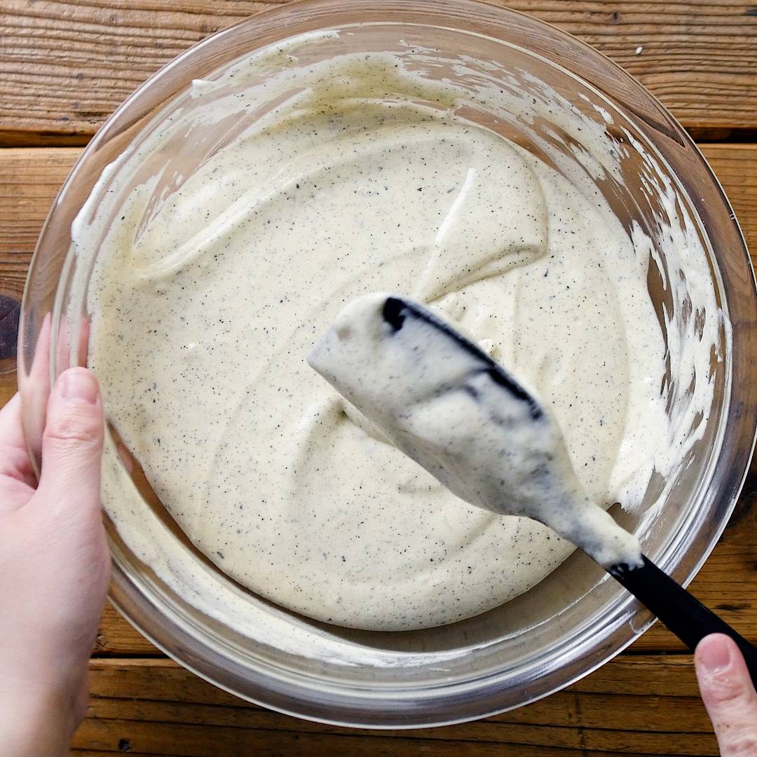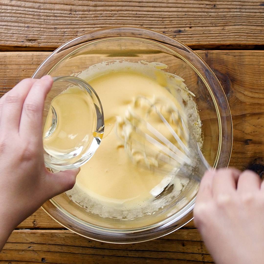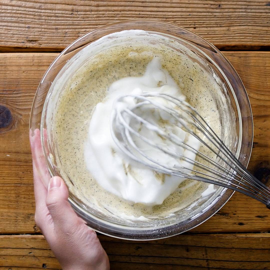 メレンゲのボウルに⑦を流し入れゴムベラで混ぜ合わせます。