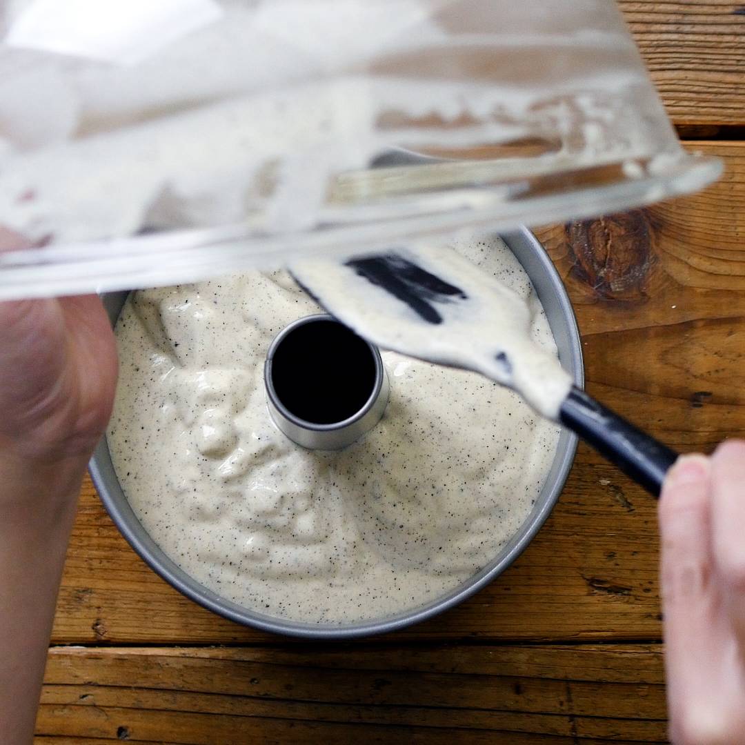 高い位置から生地を流し入れることで、大きな空洞ができにくくなります。
