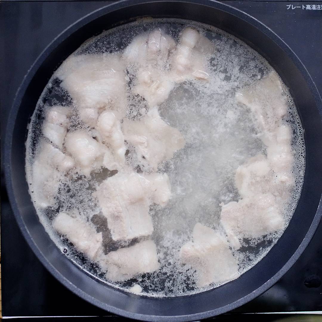 フライパンに水を入れて沸騰させ、 だしの素と豚バラ肉を入れて、 肉に火が通るまで煮込みます。※アクが出たら取ってください。