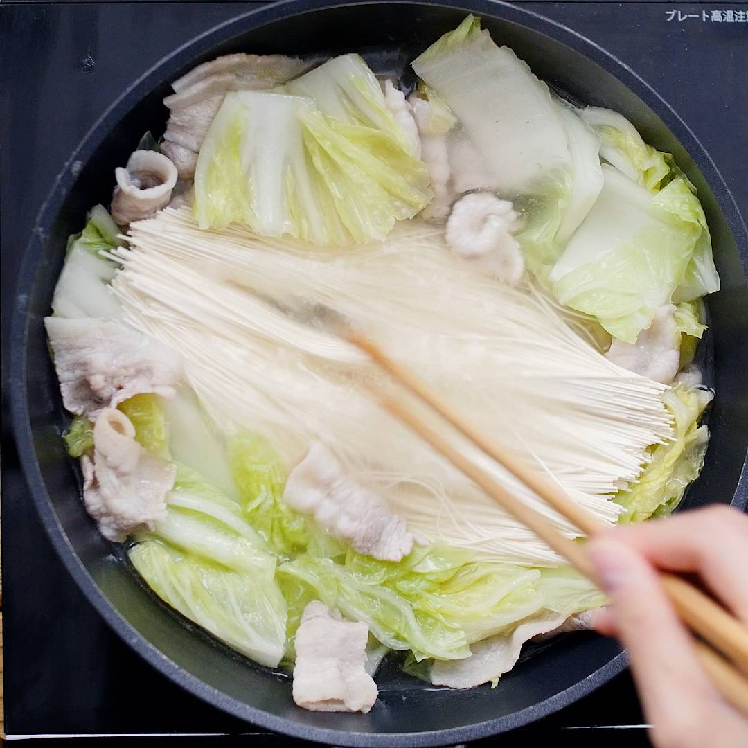 白菜を入れて煮込み、しんなりしてきたら、 具材をフライパンの端に寄せてそうめんを加えます。