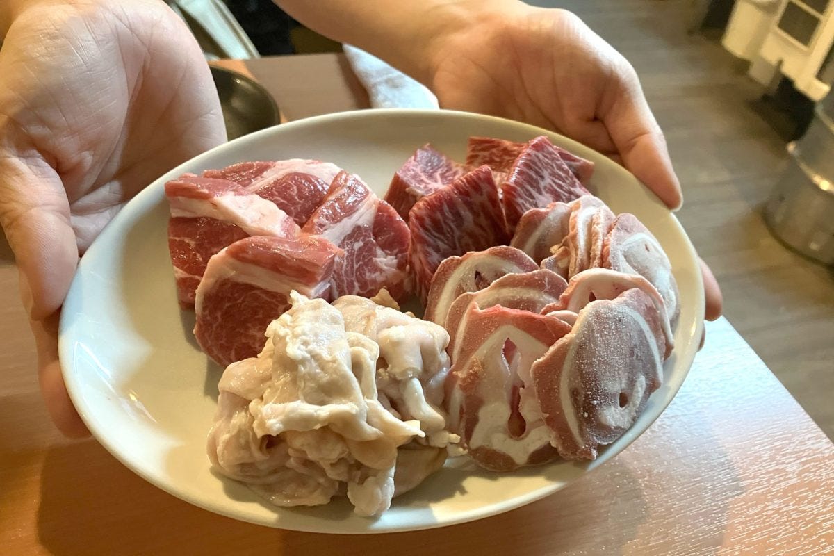 ジンギスカンメニューを注文すると、北海道愛が素晴らしい皿に載って大量の肉が登場。同店オーナーの住友竜也さんは北海道北見市出身だそうで、ジンギスカンへの思いはもちろんだが、地元に根付いた「北見焼肉」の素晴らしさを伝導すべく、2018年8月に同店をオープンさせたのだ。