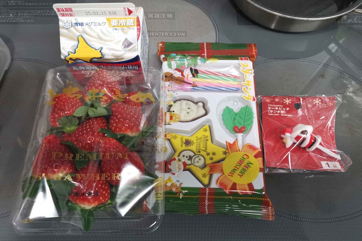 お次は仕上げのクリーム作りやデコレーション。材料は「いちご1パック 600円、生クリーム200ml 300円、飾り 400円」計1300円。当たり前だがスポンジの材料費よりも10倍以上の費用がかかる。生クリームを植物性にしたり、いちごの品質を落とせば安上がりになるかもしれないが、せっかくのクリスマスなので貧相になるのは避けたいところ。
