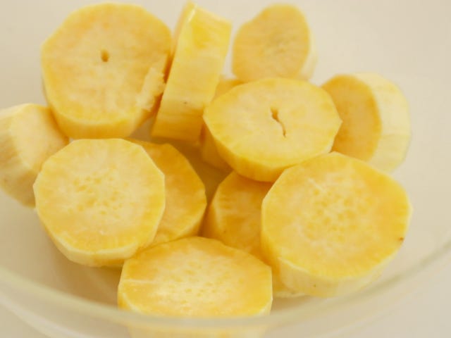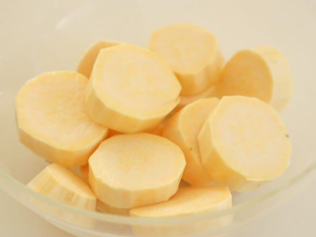 ① さつまいもは皮をむき、1~2cm程度の輪切りにして水にさらす。