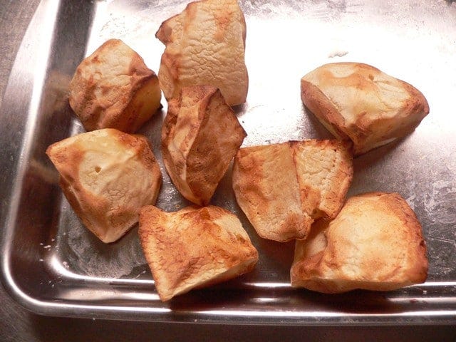 大きく切ってノンフライヤーで、柔らかくなるまで加熱。この加熱方法(オーブン焼きや油で揚げても同様)だと、多少長く煮込んでも煮崩れない。