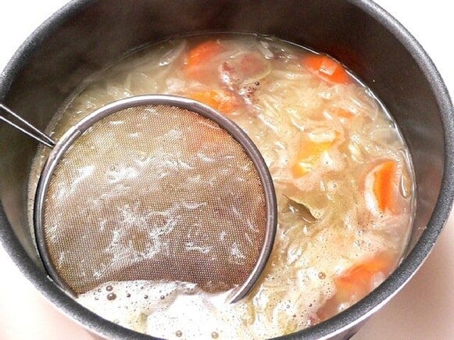 ローリエを入れ、鍋のふたを少し開けて煮る。沸騰したらアクを取り除き、弱火にして20分ほど煮込む。