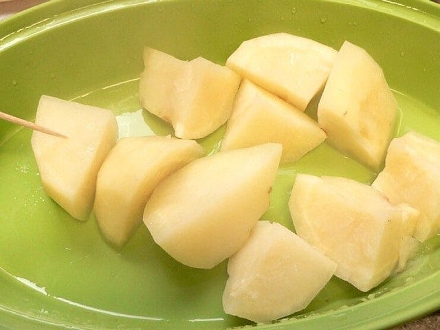 10等分に切って電子レンジに入れ、600Wで5分ほど、柔らかくなるまで加熱する。こちらは、長く煮込むと煮崩れやすい。