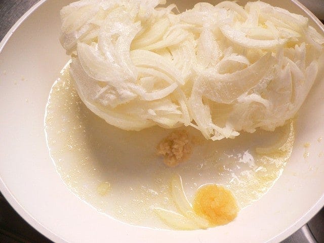 フライパンにバターを溶かし、たまねぎ、生姜、ニンニクを入れ、中火で炒める。