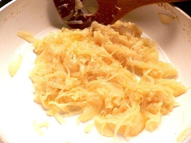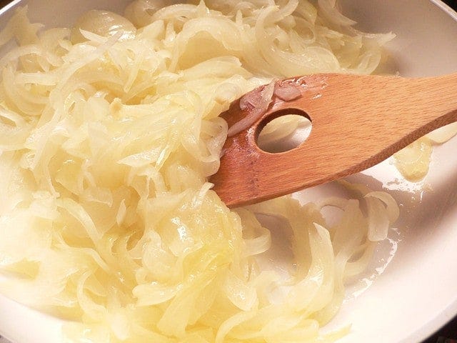 焦げそうになったら火力を調整しつつ、色づくまで15分ほど炒めて、煮込み鍋にあける。 飴色にならなくても、写真ぐらい色づけば十分です。