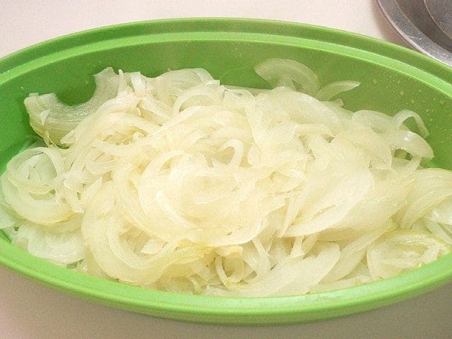 たまねぎをできるだけ薄くスライスする。耐熱容器に広げ入れ、ラップなしで、電子レンジ600Wで5分加熱する。一度取り出して混ぜ、更に5分加熱する。 飴色たまねぎを時短で作るための一手間。