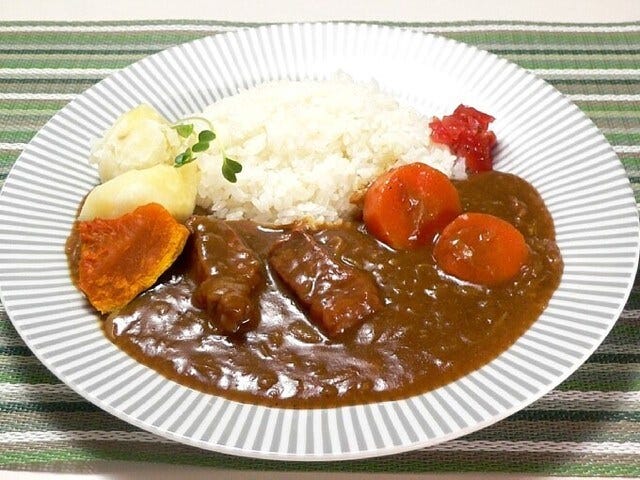 器にご飯とカレーをよそい、お好みで福神漬けやラッキョウを添える。