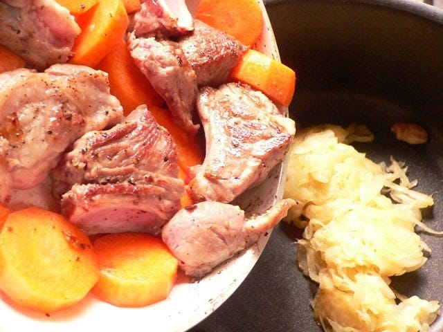フライパンに油を少量ひき、肉を並べて焼いて表面に焼き色をつける。にんじんを入れて炒め合わせ、ワインをふりかける。