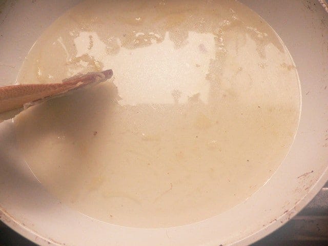 フライパンに水(分量内)を入れ、鍋肌についた旨味を洗い落として煮込み鍋にあけ、残りの水を入れる。