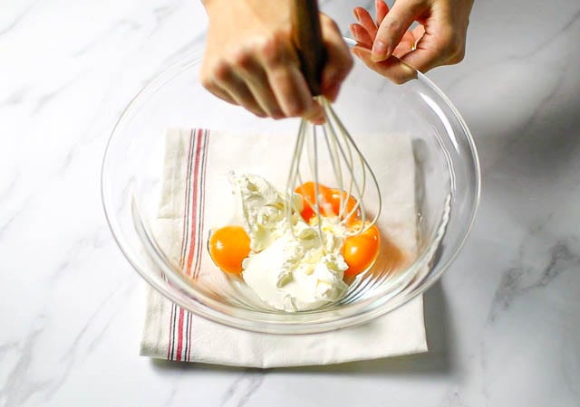 ② 卵黄が入ったボウルにクリームチーズを加え混ぜ合わせます。