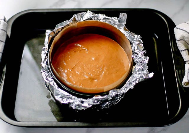 ・型に繰り返し使えるオーブンシートまたはクッキングペーパーを敷いておきます。底が抜ける型なら、(湯煎焼きをするので水が入らないように)アルミホイルで型を覆っておきます。