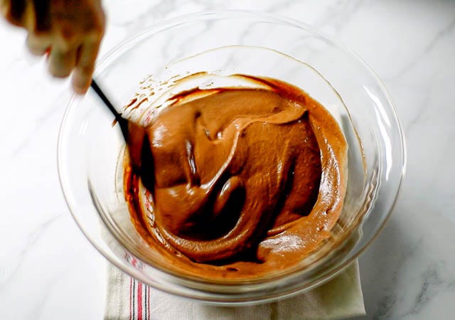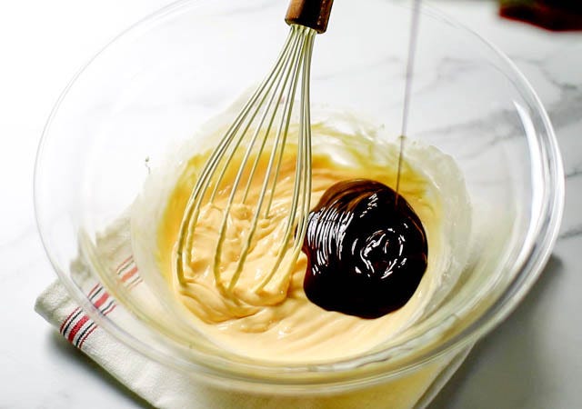 ⑤ メレンゲをクリームチーズの生地に3回に分けて加えます。ホイッパーでメレンゲをほぐすようにしてゆっくりと混ぜ合わせます。ホイッパーでざっと混ぜ終わったら、ゴムベラに変えて下から上に円を描くようにして混ぜます。(メレンゲが軽いので下にチョコレート生地が混ざらずに溜まっているため、ゴムベラでそれを持ち上げて混ぜてあげる感じです)