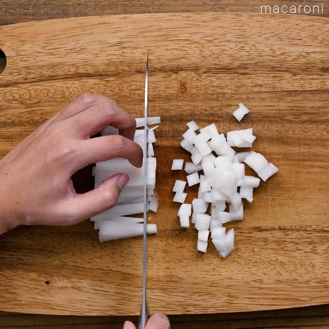 大根は皮をむき、1cm角に切ります。