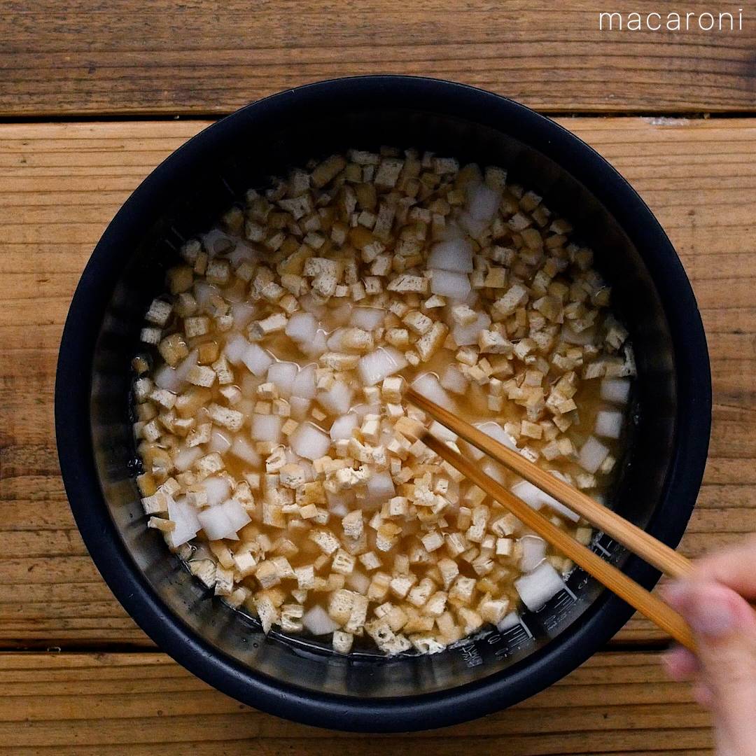 炊飯釜に米、(a) 、水を入れて混ぜ合わせ、大根、油揚げを加えて炊き込みご飯モードで炊飯します。