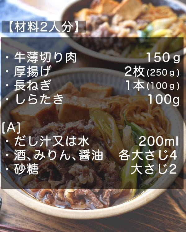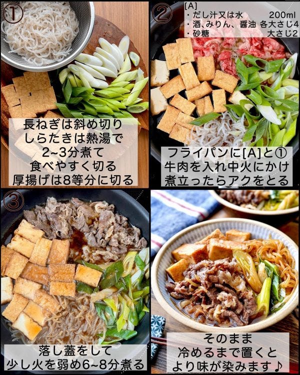 1、長ねぎは斜め切り、しらたきは熱湯で2~3分煮て食べやすく切る。厚揚げはそれぞれ8等分に切る。牛肉は食べやすく切る。
