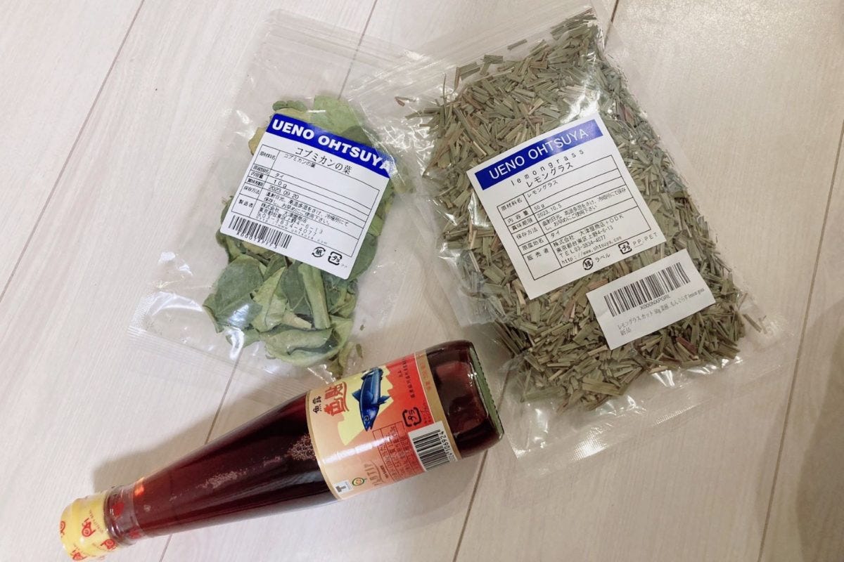 ネットでも買える、コブミカンの葉やレモングラスなどの乾燥ハーブをティーパックに入れて、煮出したら鶏ガラスープやナンプラーで味付け。