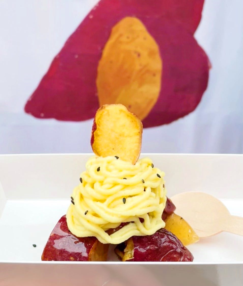 油で揚げずに店内でじっくりと焼き上げた、自家製の「はちみつバターの焼き大学芋」は、はちみつバターを使⽤することで、通常の大学芋とはひと味違った濃厚で奥深い“をかしな”⼤学芋に仕上げている。優しい⽢味のお芋のモンブランクリームを重ねることで日本最高峰の山 “富士山”を、トップにのせた芋チップスは“日の出”に見立てている。