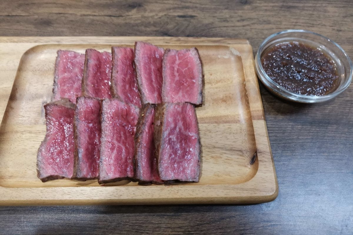 まずおススメしたいのは、ローストビーフ。使用する材料は和牛もも肉とちょっとだけ高級だが、一般的に売られているローストビーフがだいたい100グラム800円前後なことを考えると、和牛もも肉は700円前後なので手作りすれば安上がり。