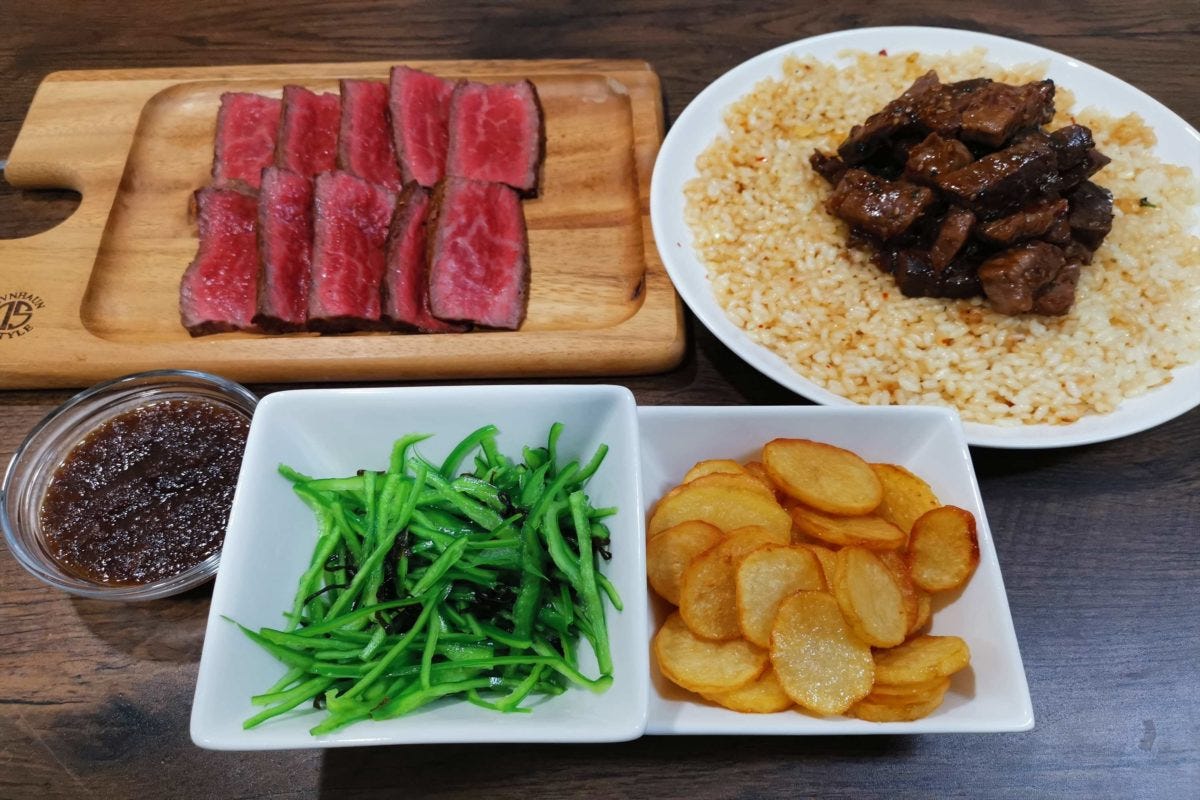 3つの工程を手際よくやれば、合計で2時間かからないため昼の買い出しからディナーまでに十分間に合う。まずじゃがいもを茹でつつローストビーフをアルミホイルで包むところまで作業し、ガーリックライスを炊き始めてからフライドポテトを揚げ、ローストビーフのソースを作るのが流れとしては良いだろう。