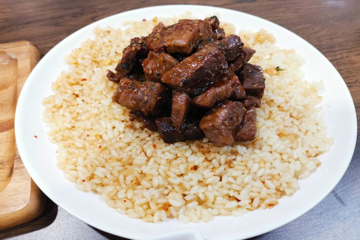 次におススメなのが、ガーリックライス。ガーリックライスも炊飯器不要で鍋で炊け、ローストビーフで使用する牛肉の形を整えるときに出る切れ端を使えば良いため、余り物がなくなる。