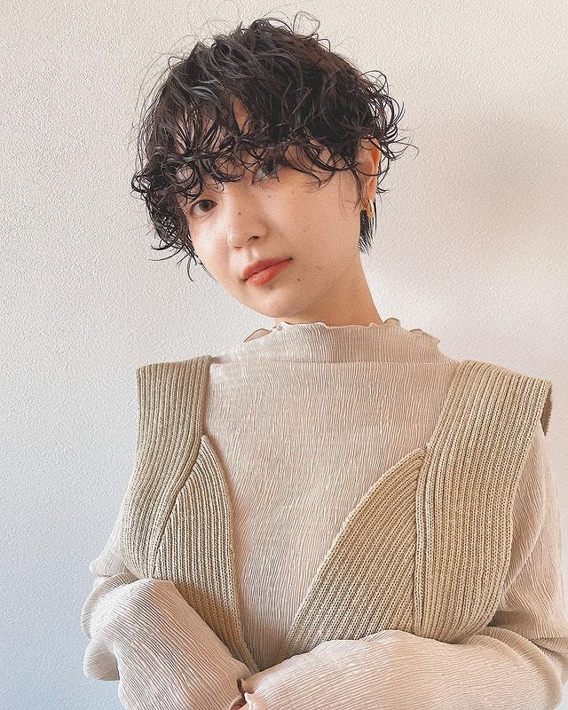 求心顔の女性には、しっかりめのパーマをかけたショートパーマの髪型が似合います。