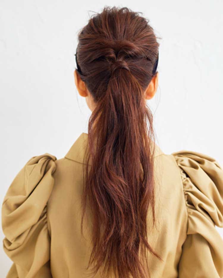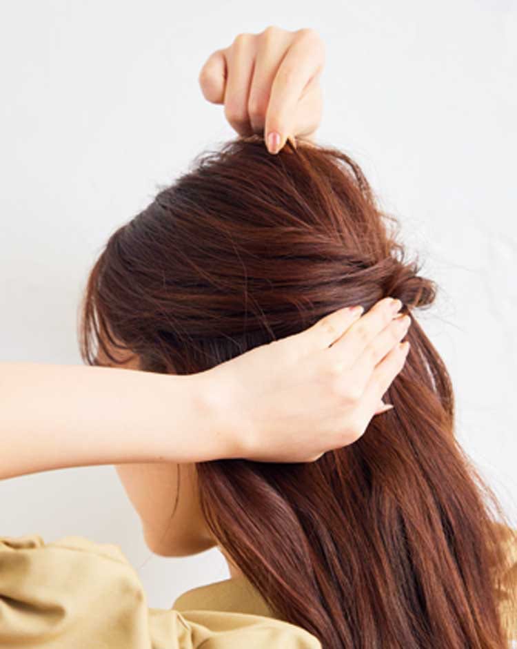 後頭部は指先で毛束を引っぱり丸いシルエットに整える。くるりんぱの結び目のすぐ下でひとつに結んだら完成。