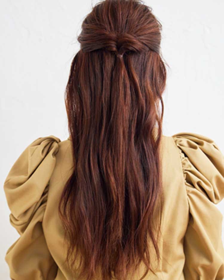 耳の高さでハーフアップを作りくるりんぱしたら、左右均等にほぐす。