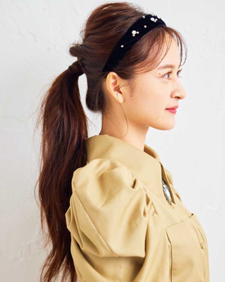 シックなくるりんぱポニテ クリスマスの本気デートにもぴったり!ラグジュアリーな場所に映える簡単&華やかなアレンジ♡ シャツ 7,480円/REDYAZEL ルミネエスト新宿店 ネックレス 13,500円、イヤリング 8,400円、リング 11,550円/以上アビステ カチューシャ 2,068円/flower How to シックなくるりんぱポニテの作り方 ①ハーフアップを作る 耳の高さでハーフアップを作りくるりん