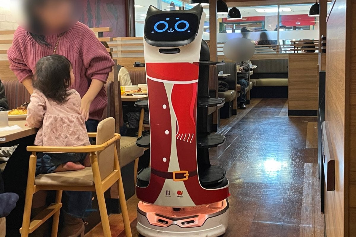 周りを見ると、買い物袋を持った60代と思われるご夫婦、お子さん連れの若い家族、大学生らしきカップルもこれを注文している。猫の顔がついた配膳ロボットもこの時期はサンタ仕様だ。ファミレス最大の魅力である気軽さ、そして肩肘張らないカジュアルな空間で楽しむコース料理が、妙に心地よかった。