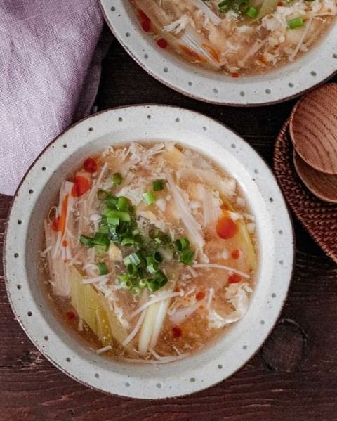 えのきの食感と程よい酸味が食欲をアップさせてくれるサンラータンは、イカフライの献立にプラスすると味のメリハリがアップしますよ。