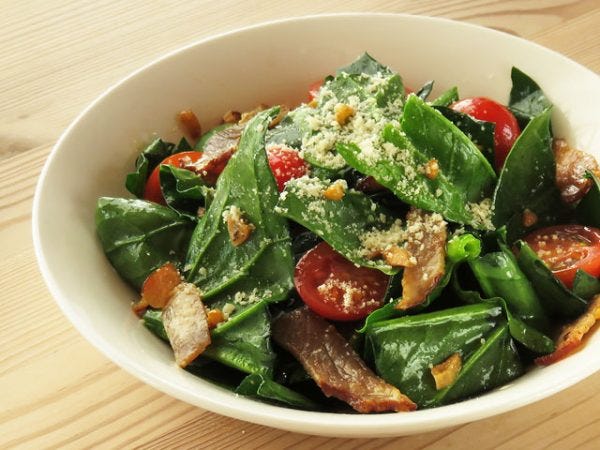 じっくりと炒めたベーコンとパルメザンチーズが相性抜群の、ほうれん草とミニトマトのサラダです。