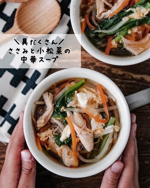 中でもささみや小松菜などの野菜をたっぷり使った満足感のある中華風スープは、揚げたてのイカフライと相性抜群ですよ。