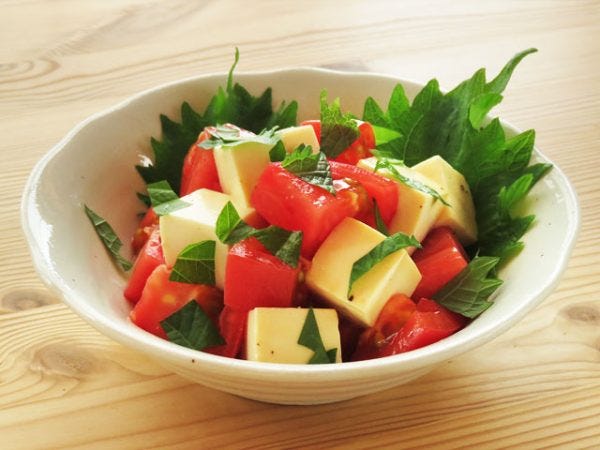 良質なタンパク質の宝庫でもあるお豆腐と瑞々しいトマトに、アクセントになる大葉を散らしたこちらのレシピは、手作りのドレッシングが味の決め手。