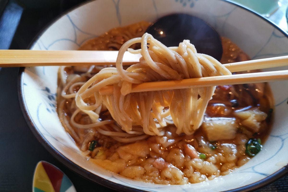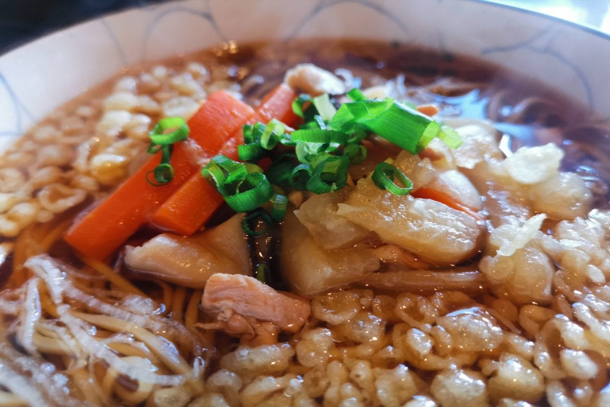 野菜はにんじんや大根など具沢山で、鶏肉も入っているため食べ応えはバツグンだ。また、そば自体も風味が良く量も多いため、1杯で大満足のボリュームである。