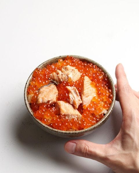 ご飯の上に鮭をのせたら、さらにいくらをたっぷり乗せれば見た目も豪華になります。