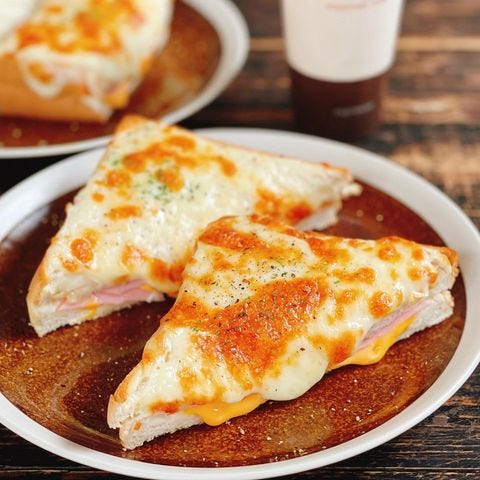 1枚のピザにはベーコンとチーズを乗せて焼き、間にオムレツとケチャップを挟んだホットサンドはボリューム満点でしっかりお腹を満たしてくれます。