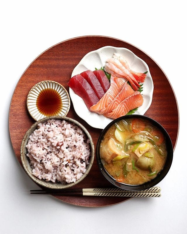お刺身を家族分取り分けて、具沢山のお味噌汁とご飯をお盆にのせて定食風に盛り付けると、まるで旅館の朝食のように見えます。