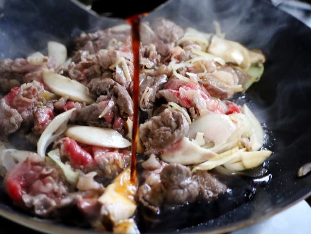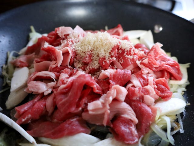 ② 斜め切りにしたエリンギと薄切り牛肉の切り落としを加え、砂糖を振りかけたら、肉をほぐしながら炒める。