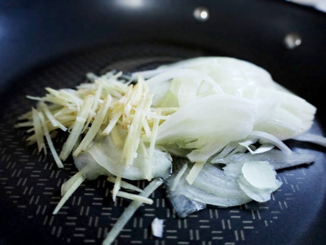 ① フライパンに油(分量外)をひき、千切りにしたしょうがと薄切りにした玉ねぎを入れたら火を点け、しなりするまで中火で炒める。