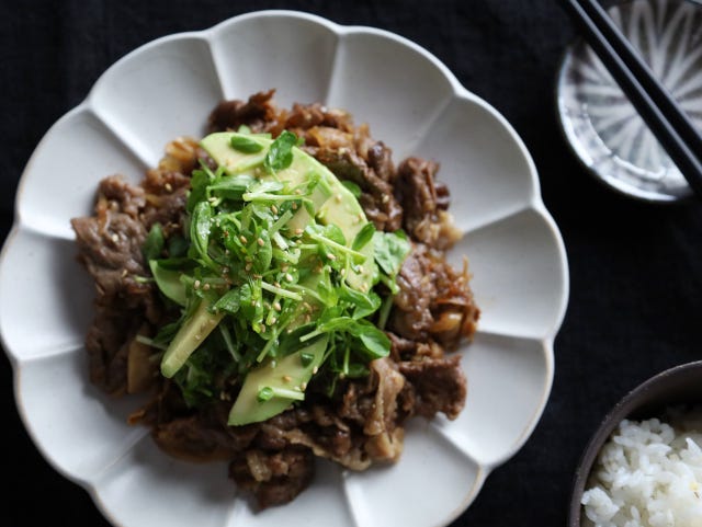 アボカドのクリーミーな食感とシャキシャキの豆苗が、甘辛のすき煮に合いますよ。