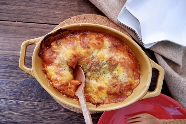 ⑤ 水気が減ってとろみがついたらグラタン皿に入れ、チーズをかけてトースターで5~10分焼く。