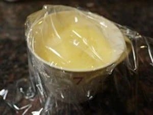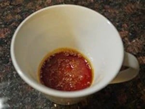 マグカップにグラニュー糖大さじ1と水小さじ1を入れ、よく混ぜます。写真のようなカラメル状になるまで、500Wの電子レンジに約2分30秒かけます。小さじ1の水を加えよく混ぜます(この時カラメルがはねることがあるので注意してください)。