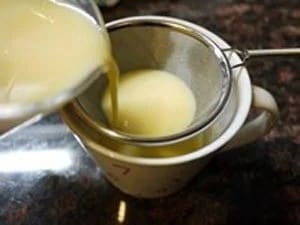 茶こしでこしながらプリン液をマグカップに注ぎます。表面がふんわりと盛り上がるくらいまで、500Wの電子レンジに約2分30秒かけます。