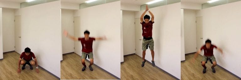 しゃがんだら両手の指先を床につけます。その後、一気に真上にジャンプしつつ、空中でカラダを90度回転させます。この動作を連続して行います。